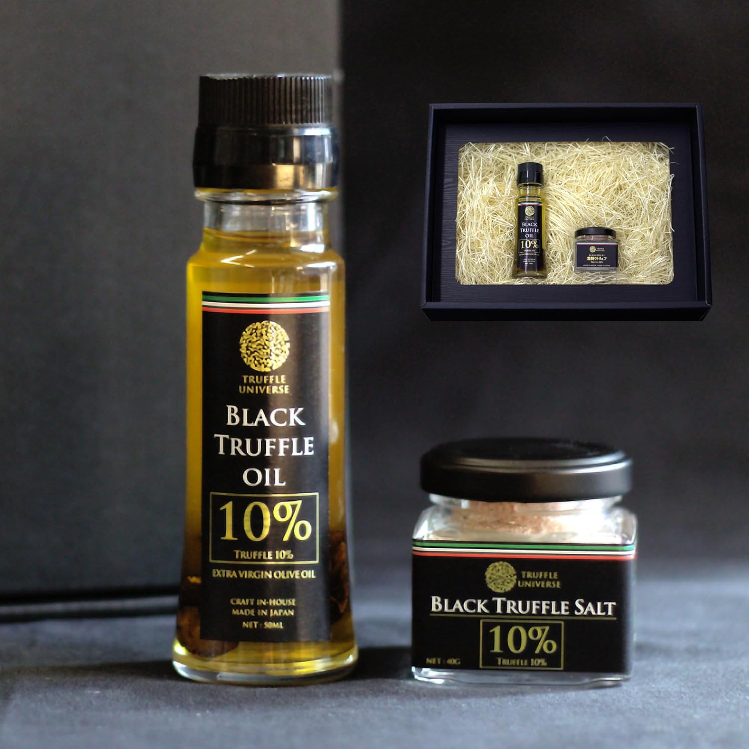 【香りを贈る】高級調味料 ギフト 黒トリュフオイル & トリュフ塩 2点セット 【含有率10% 日本製 無添加(酸化防止剤・着色料・保存料不使用)NON-GMO】日本製 ステーキ パスタ 卵料理 調味料 プレゼント お返し 誕生日 内祝い 出産祝い 引越し祝い お年賀 お歳暮 一人暮らし 友人 ギフトボックス入り Truffle Universe